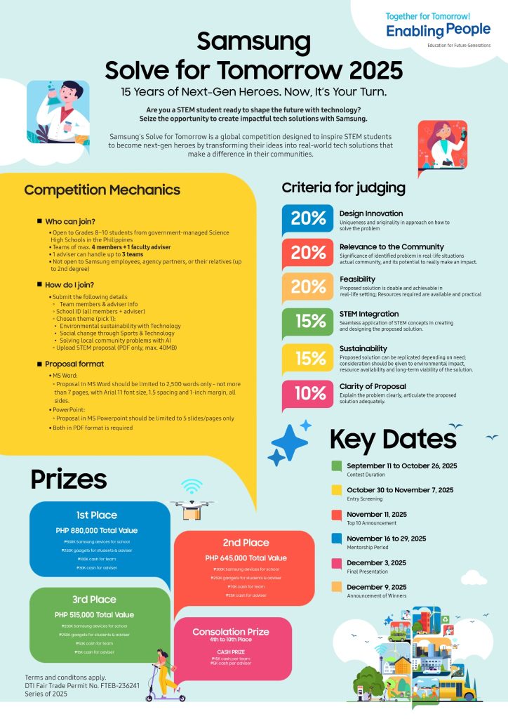 To participate in this year’s Solve for Tomorrow, please visit https://www.samsung.com/ph/solve-for-tomorrow/. You can also follow Samsung Philippines on social media for the latest updates: Facebook- www.facebook.com/SamsungPH, X- www.x.com/SamsungPH, Instagram- https://www.instagram.com/samsungph/#.