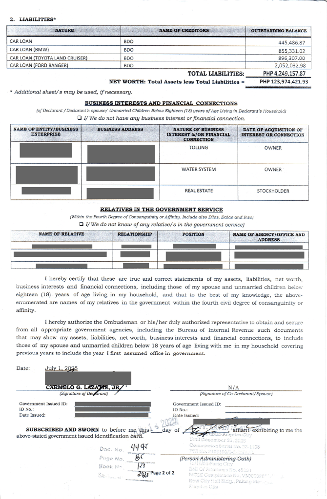 FIRST DISTRICT, Pampanga – Pampanga First District Representative Carmelo “Pogi” Lazatin Jr. publicly disclosed the contents of his Statement of Assets, Liabilities, and Net Worth (SALN) on September 26, 2025.