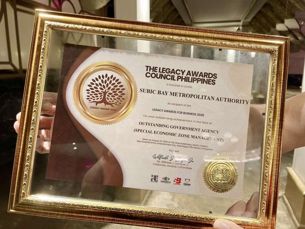 Subic Bay Freeport – The Subic Bay Metropolitan Authority (SBMA) was conferred as an Outstanding Government Agency for Special Economic Zone Management by the Legacy Icon Awards during the Gala Awards Presentation event held at the Grand Ballroom of Okada Manila in Parañaque City on August 15, 2025.
