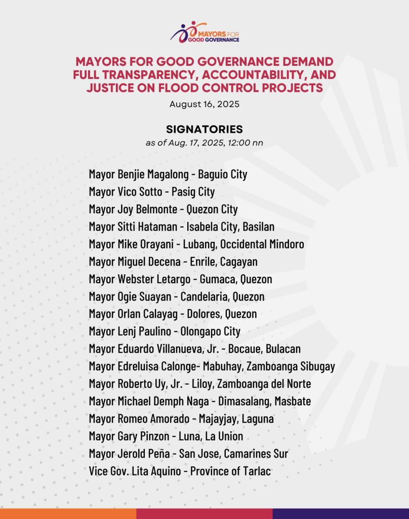 MANILA, Philippines – A coalition of local chief executives under the banner Mayors for Good Governance on Saturday, August 16, demanded full transparency and accountability in the wake of corruption allegations involving ₱350 billion worth of flood control projects.