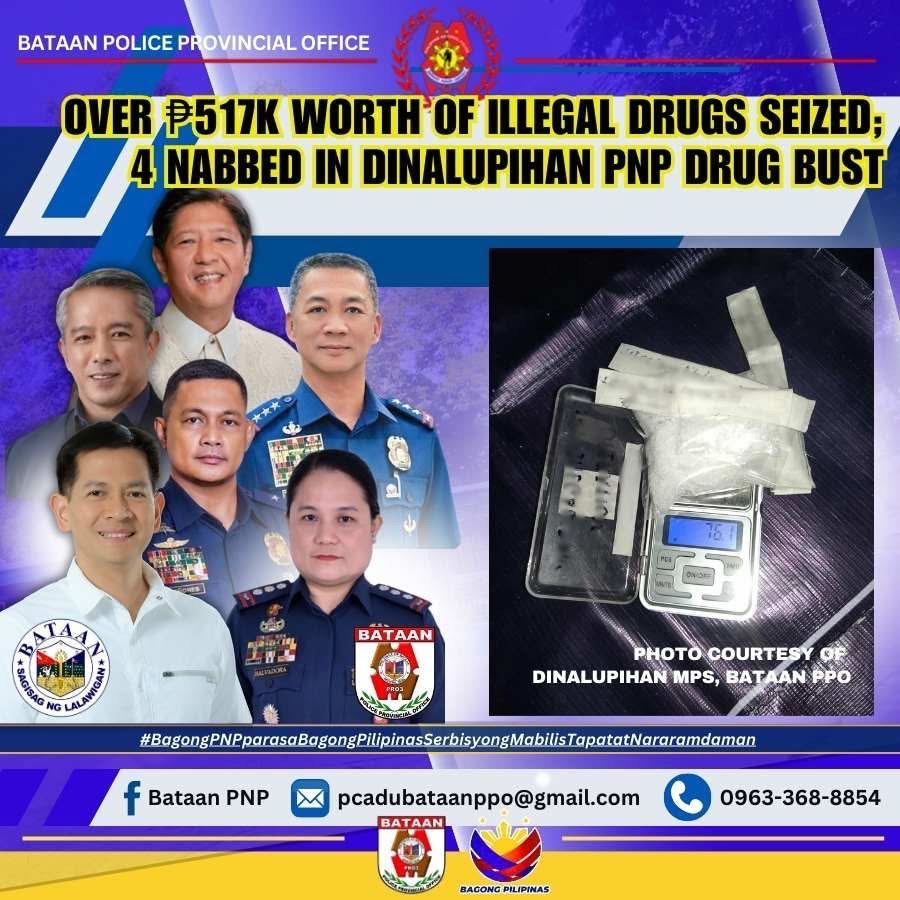 BALANGA CITY – Bataan Police Provincial Office (PPO) seized about 76.1 grams of suspected shabu worth P517,480 in a buy-bust operation at Barangay Pita, Dinalupihan town.