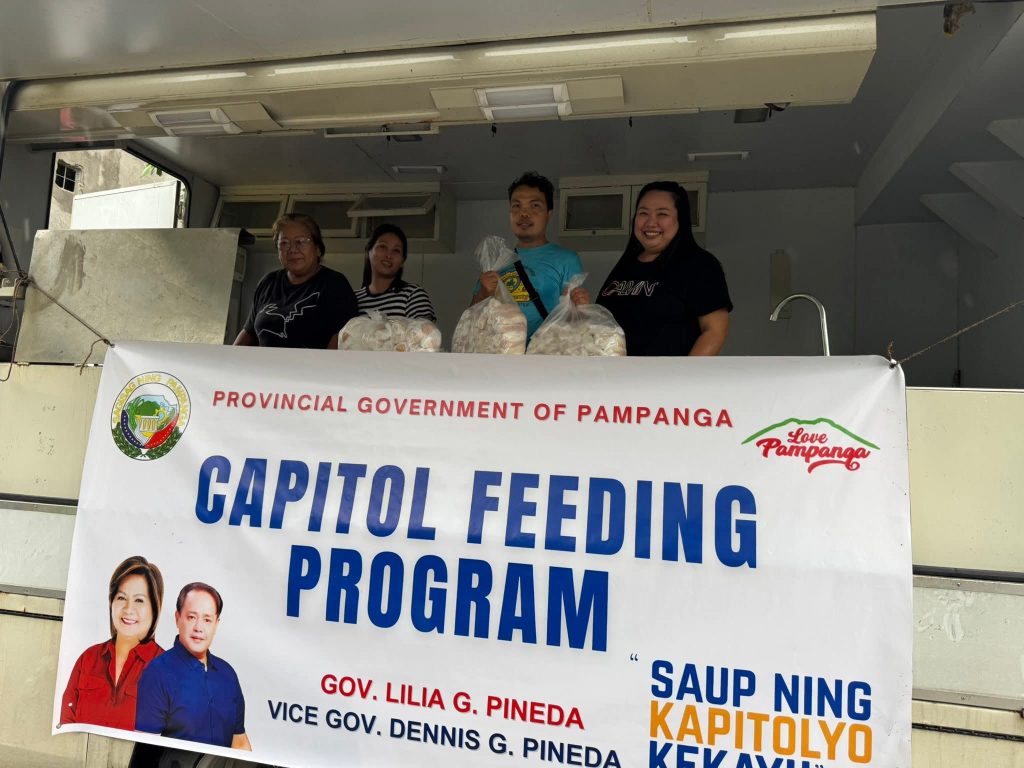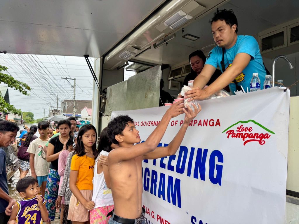 BACOLOR, Pampanga – The Provincial Government of Pampanga, led by Governor Lilia “Nanay” Pineda, deployed its mobile kitchen to serve hot meals to residents affected by flooding in Barangay Tinajero.