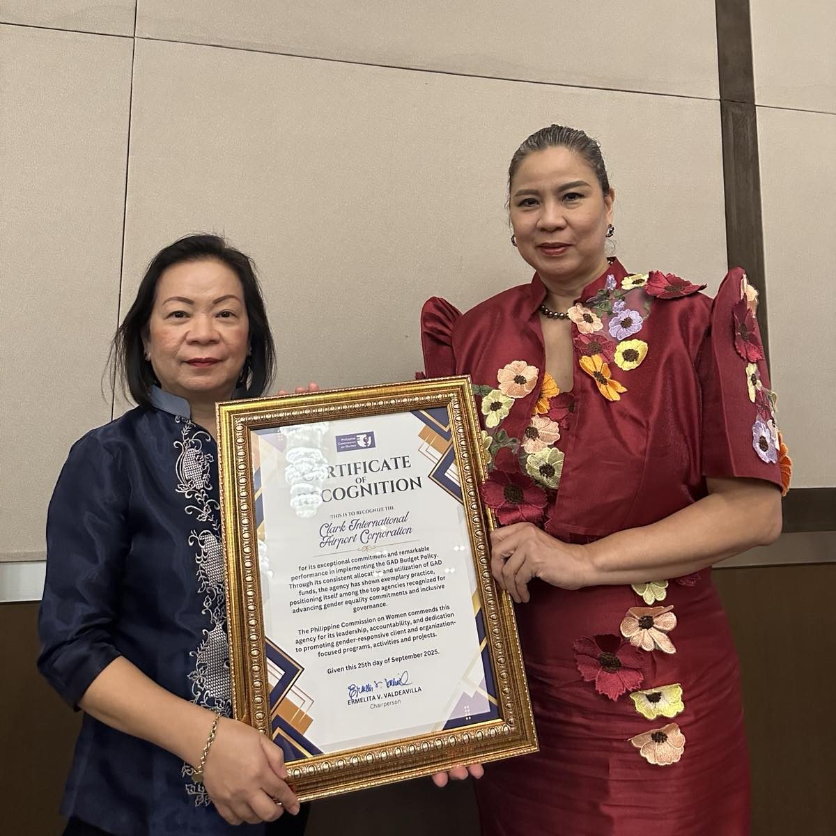 Representing CIAC at the PCW Awarding Ceremony recognizing agencies for their FY 2024 GAD Budget Performance last 25 September 2025 were GAD Chairperson and Chief Finance Officer Nancy C. Paglinawan and GAD Focal Person Riza G. Lozano.