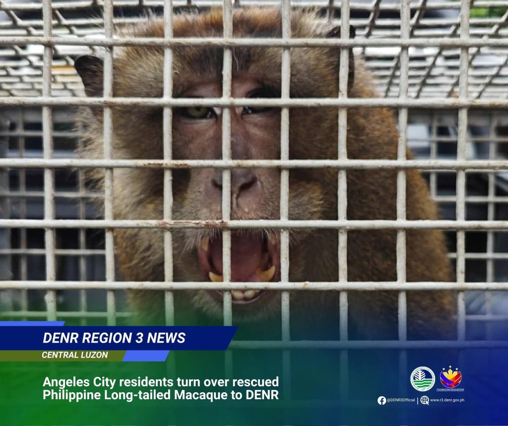 ANGELES CITY, Pampanga – Local government employees and barangay officials in Angeles City turned over a rescued Philippine long-tailed macaque (Macaca fascicularis philippensis) to the Department of Environment and Natural Resources (DENR), officials confirmed Tuesday, July 30.