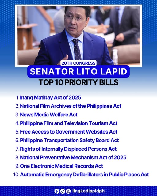 MANILA — Senator Lito “Ang Supremo” Lapid submitted his first batch of 10 priority bills on Tuesday afternoon, July 1, at the start of the 20th Congress. His proposed measures focus on improving healthcare services, including the establishment of electronic medical records for Filipinos.